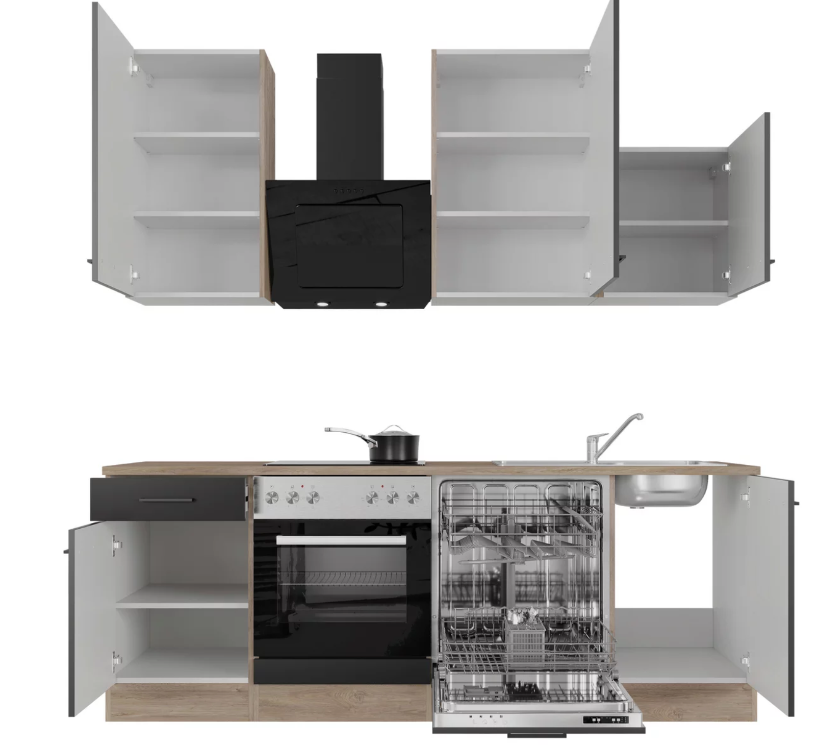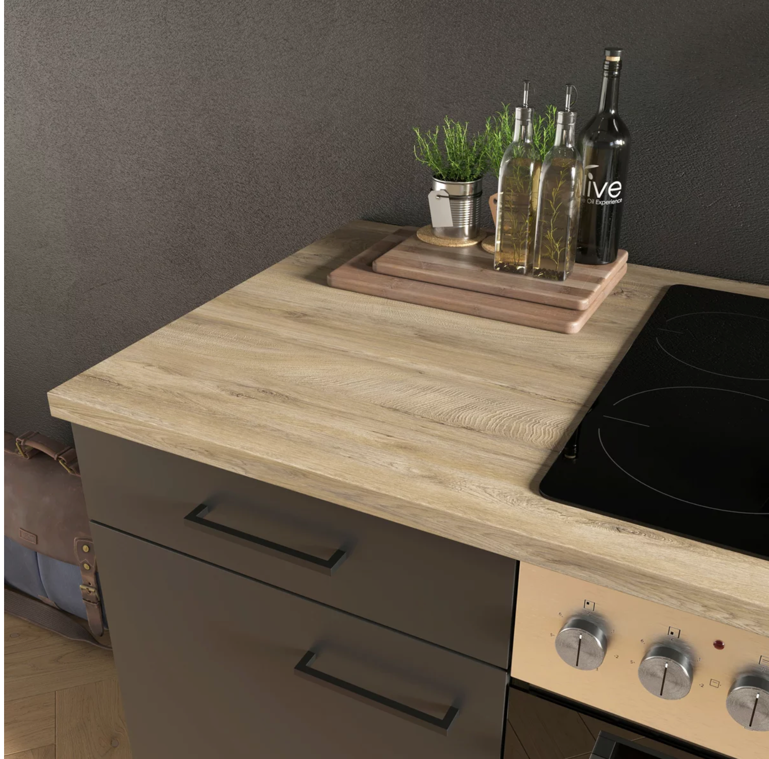 Die Capri-Serie kombiniert moderne Eleganz mit funktionaler Ausstattung. Mit ihrer mattschwarzen Antifingerprint-Front und den warmen Holzdetails in Endgrain Oak wird diese Küchenzeile zum stilvollen Mittelpunkt jeder Küche.