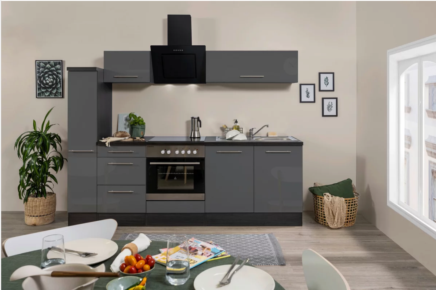 Der Küchenblock Amanda von Respekta überzeugt mit moderner Hochglanzoptik, funktionaler Ausstattung und praktischen Stauraumlösungen. Mit seinen MDF-Fronten in Grau Hochglanz und den eleganten Edelstahlgriffen bringt er zeitlose Eleganz in die Küche.