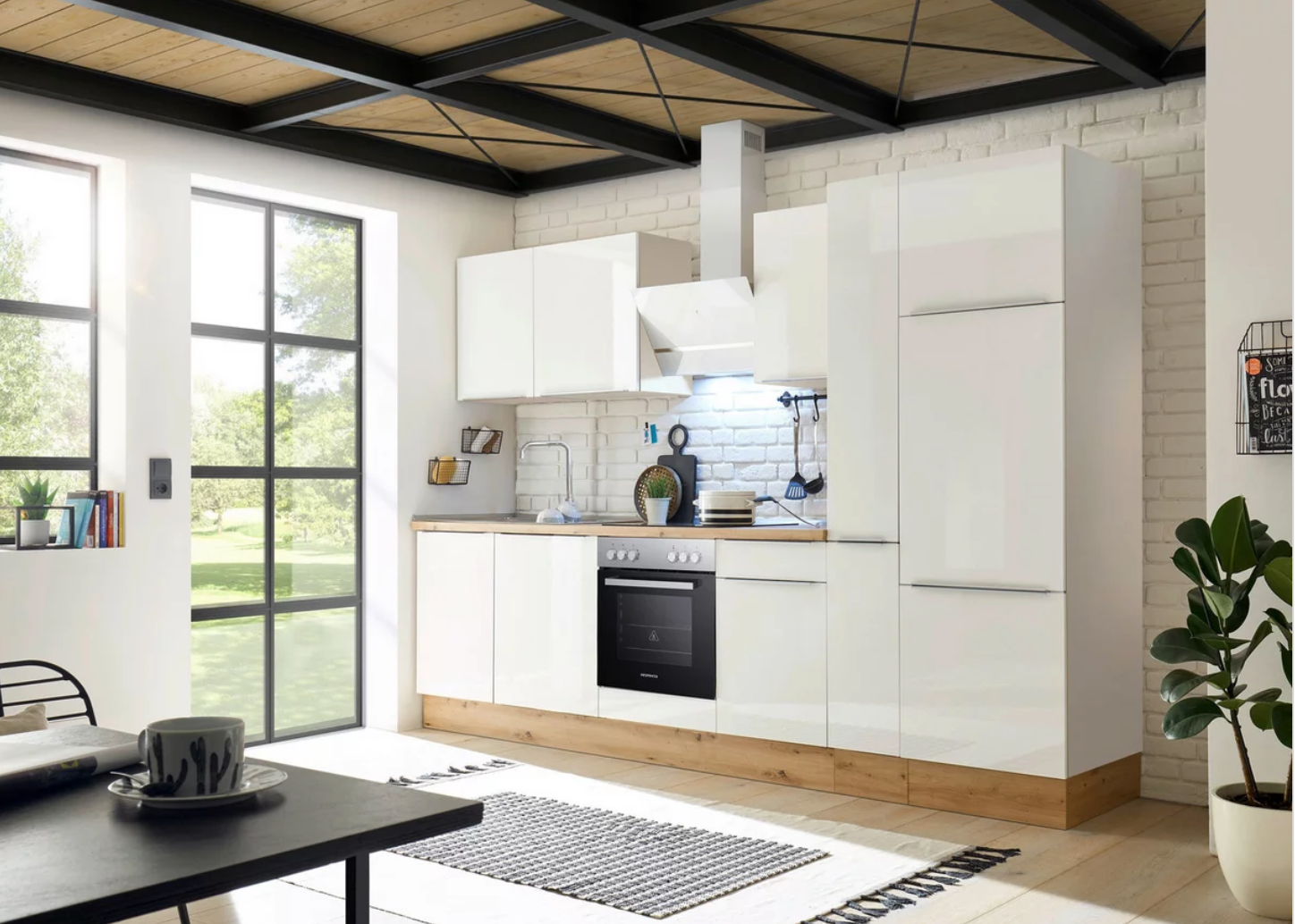 ✨ Der Respekta Küchenblock Marleen bietet eine hochwertige Komplettküche mit eleganten Weiß-Hochglanzfronten, modernen Elektrogeräten und praktischen Stauraumlösungen – perfekt für ein stilvolles Zuhause.