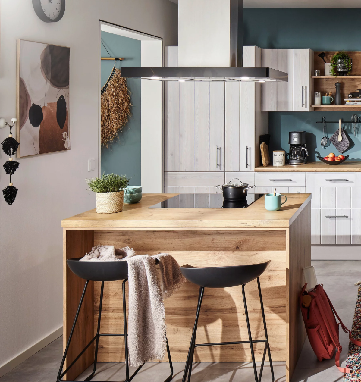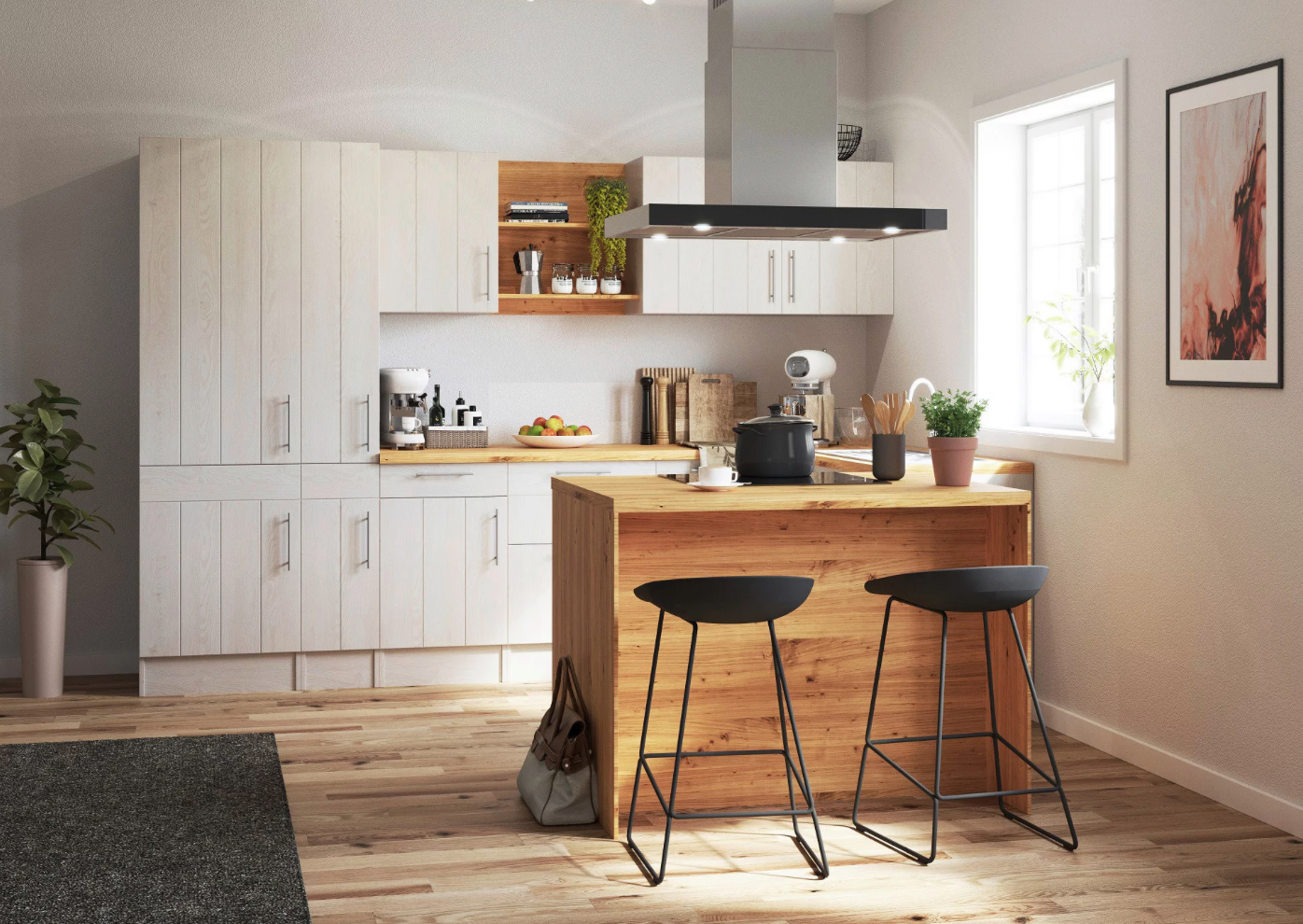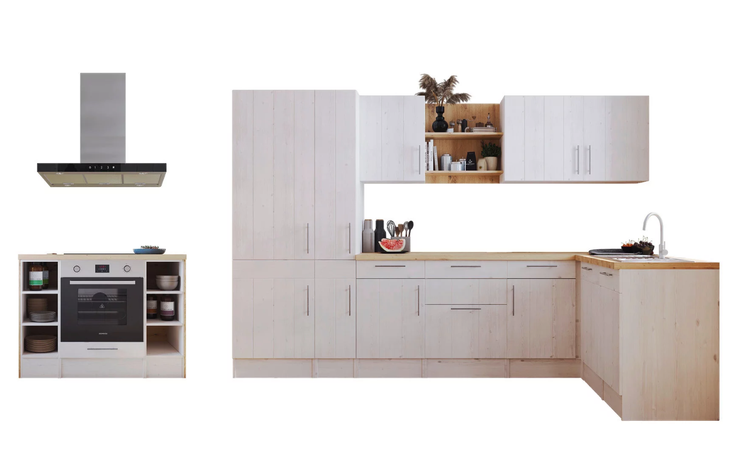Die moderne Winkelküche Anton überzeugt mit einem harmonischen Mix aus weiß-matter Lärche-Nachbildung, hochwertigen Auszügen mit Soft-Close-Funktion und einer durchdachten Stauraumgestaltung. Die großzügige Kücheninsel lässt sich flexibel platzieren – freistehend oder wandnah – und macht die Küche besonders vielseitig.
