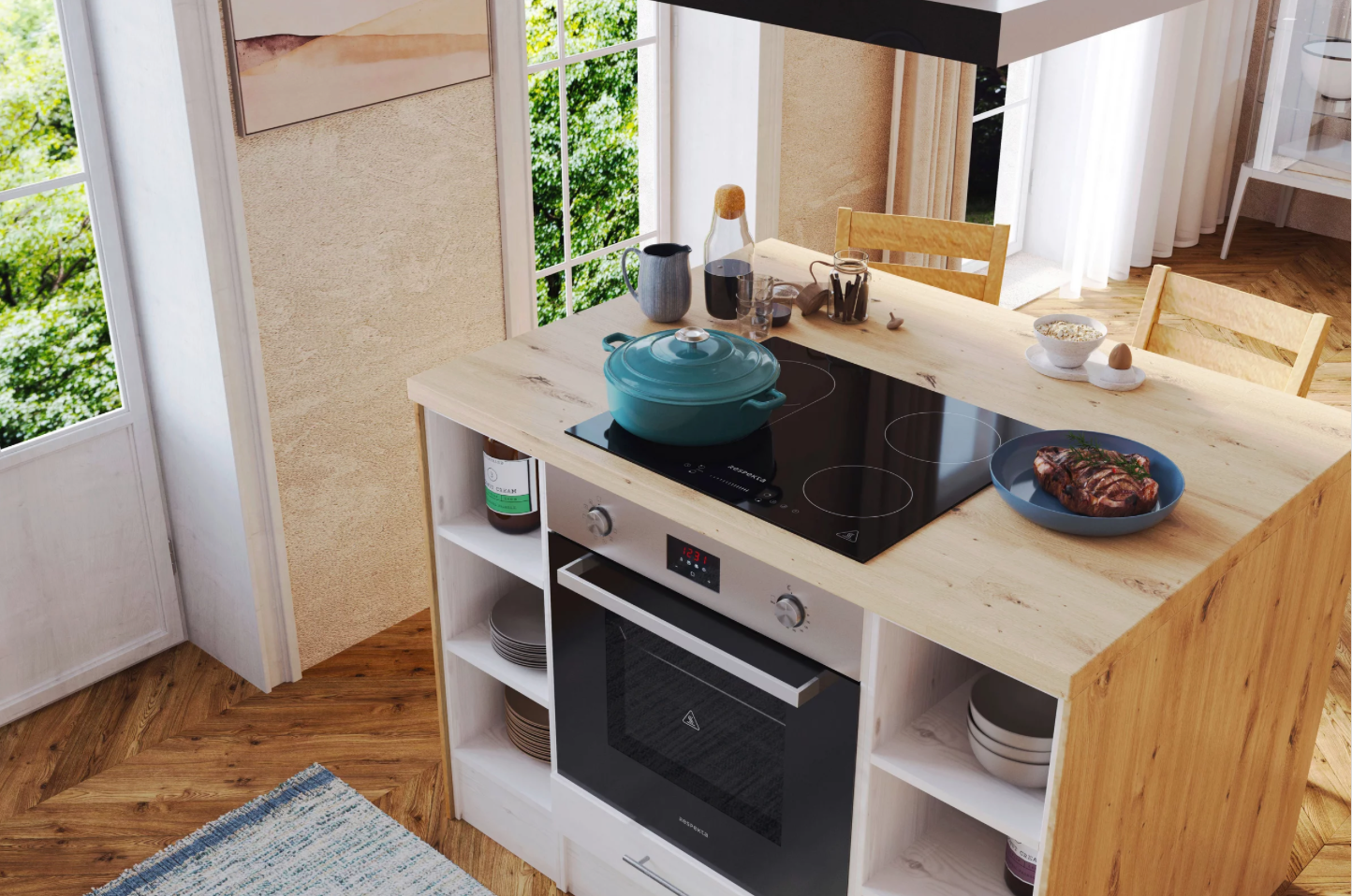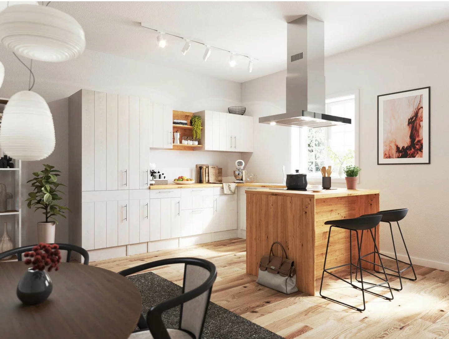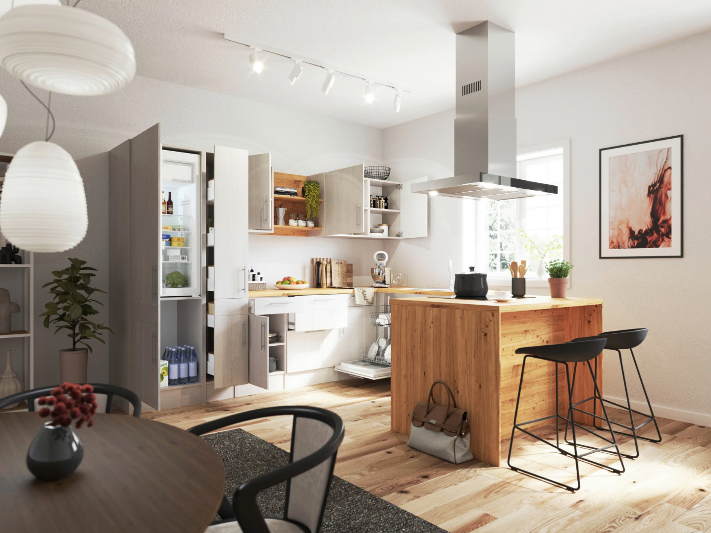 Die moderne Winkelküche Anton überzeugt mit einem harmonischen Mix aus weiß-matter Lärche-Nachbildung, hochwertigen Auszügen mit Soft-Close-Funktion und einer durchdachten Stauraumgestaltung. Die großzügige Kücheninsel lässt sich flexibel platzieren – freistehend oder wandnah – und macht die Küche besonders vielseitig.