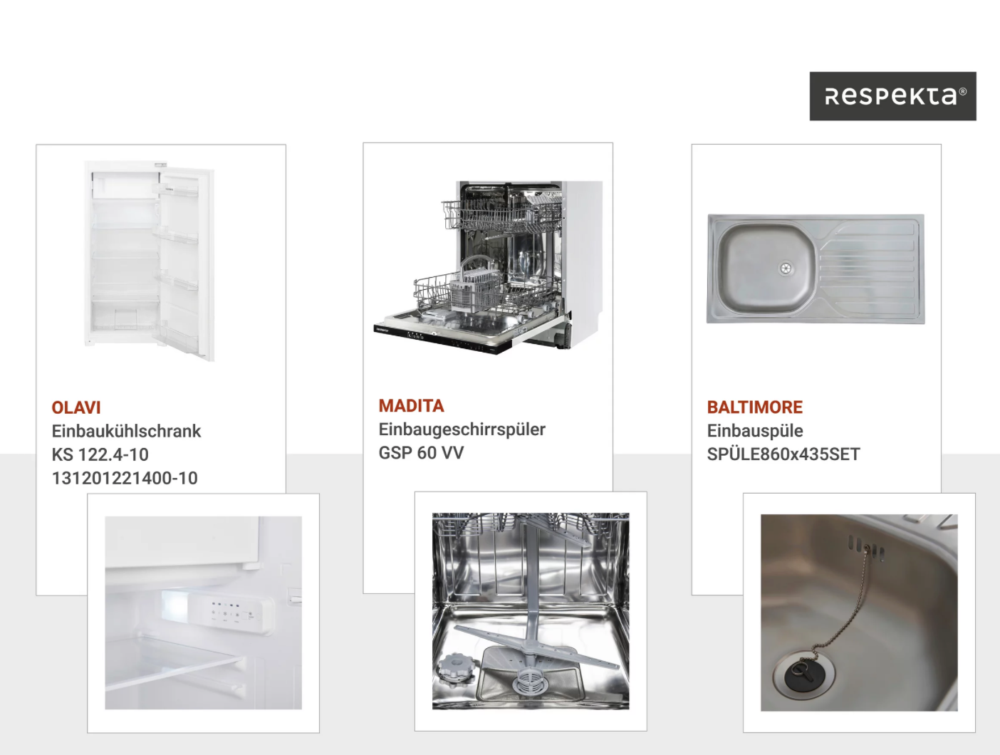 • Spüle: Edelstahl-Einbauspüle (86 × 43,5 cm) inkl. Ab- & Überlaufgarnitur