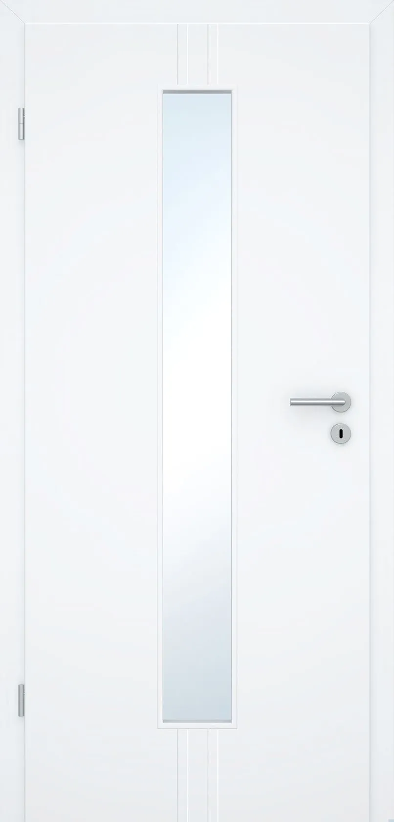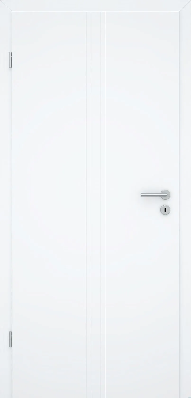 Diese stilvolle Design-Innentür überzeugt durch eine klare Formsprache und eine matt-weiße Oberfläche (ähnlich RAL 9010), die dezent mit dem Licht spielt. Zwei markante, senkrecht eingefräste Linien auf beiden Seiten des Türblatts verleihen der Tür eine edle, grafische Struktur und machen sie zu einem echten Highlight in jedem Raum.