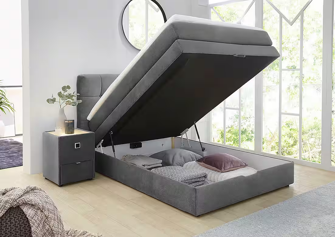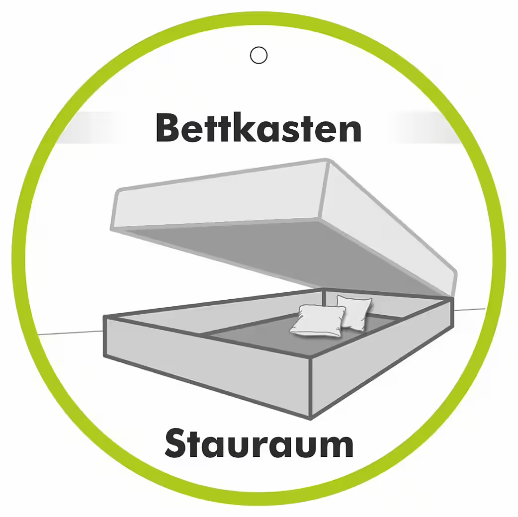 Der integrierte Bettkasten bietet besonders viel Platz für Bettwäsche, Kissen oder saisonale Textilien. Dank leichtgängiger Gasdruckfedern lässt sich der Stauraum mühelos von vorne öffnen und schließen. Integrierte Belüftungsschlitze sorgen für eine optimale Luftzirkulation und ein angenehmes Raumklima im Bettkasten.