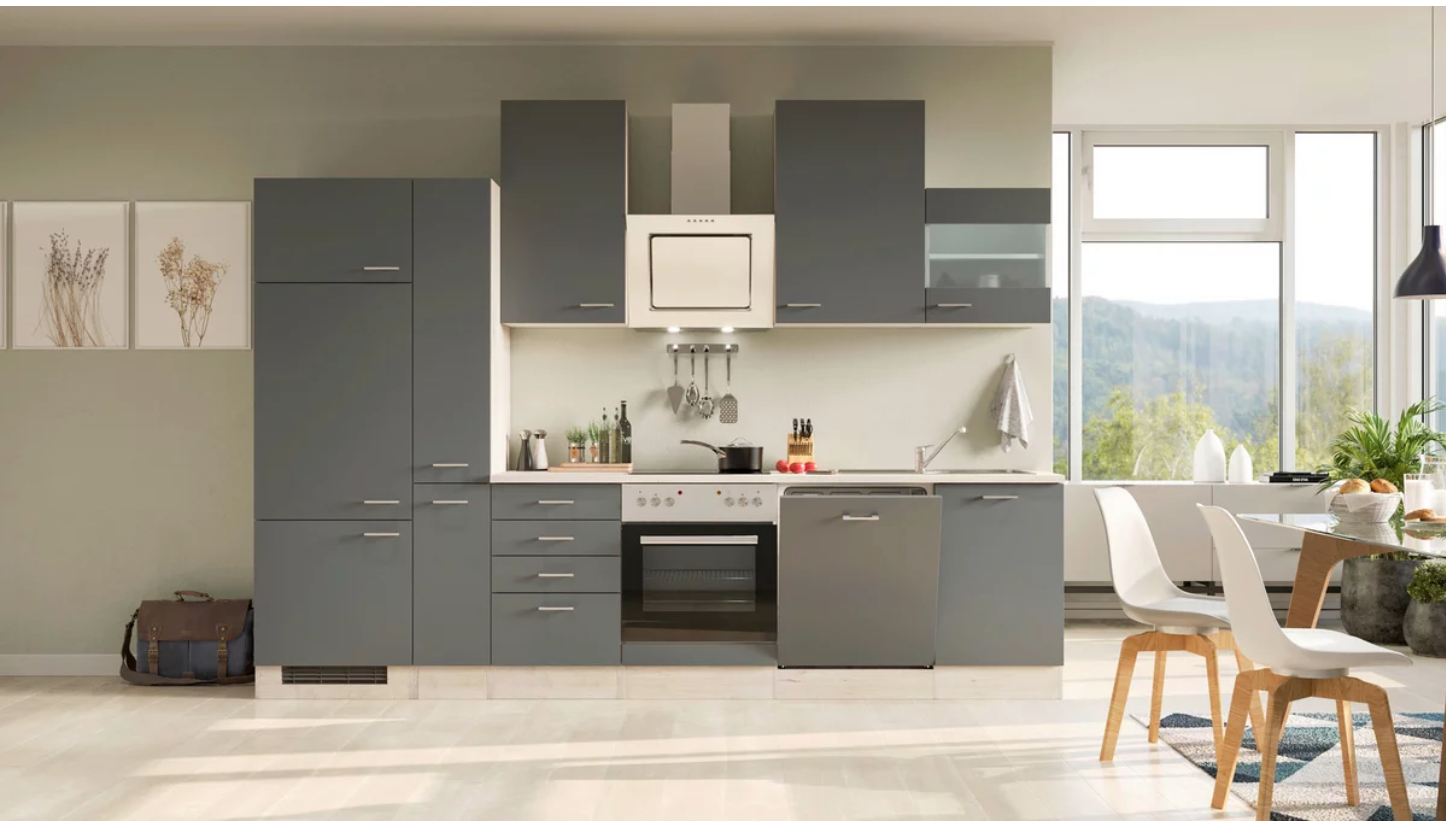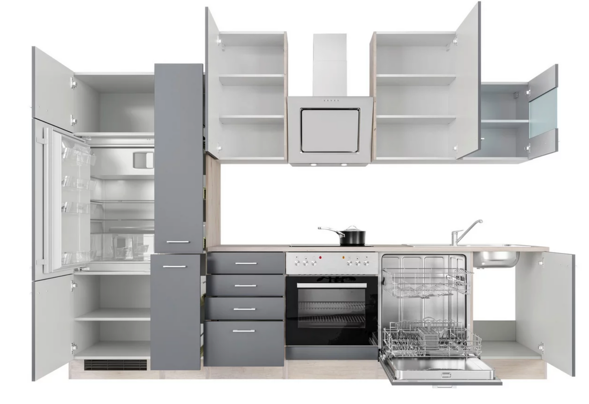 Die moderne Küchenzeile der Morena-Serie kombiniert zeitloses Design mit funktionaler Ausstattung. Die matten basaltgrauen Fronten harmonieren mit dem Korpus und der Arbeitsplatte in San Remo Eiche. Dank durchdachter Schrankelemente und integrierter Elektrogeräte bietet sie Komfort und viel Stauraum.