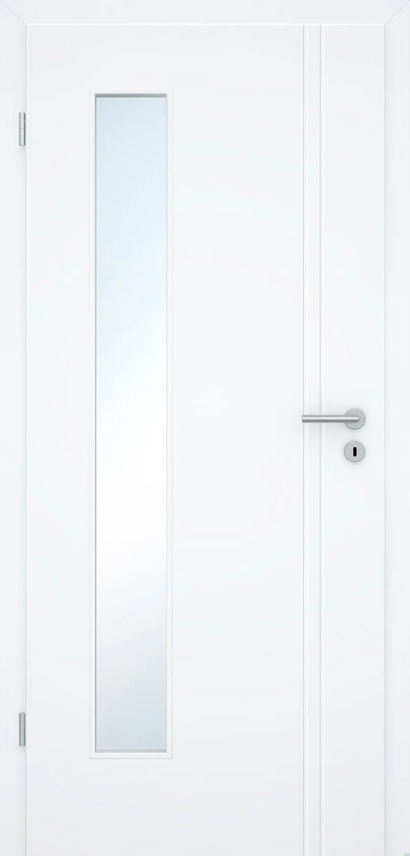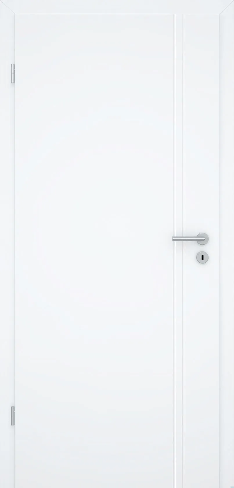 Diese Design-Innentür kombiniert eine klare Formensprache mit funktionaler Eleganz. Zwei senkrecht eingefräste Linien verleihen dem Türblatt eine zeitgemäße Optik. Die seidenmatte Weißlack-Oberfläche (ähnlich RAL 9010) bringt durch dezente Licht- und Schattenspiele besondere Tiefe in die Gestaltung.