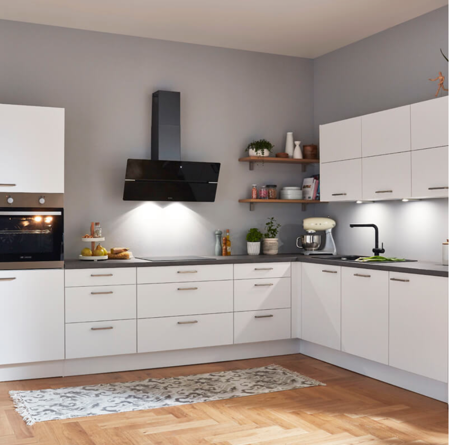 Der weiße Korpus und die hochwertig verarbeiteten, mattweißen Fronten überzeugen durch ihre pflegeleichte, unempfindliche Oberfläche ohne sichtbare Fingerabdrücke.