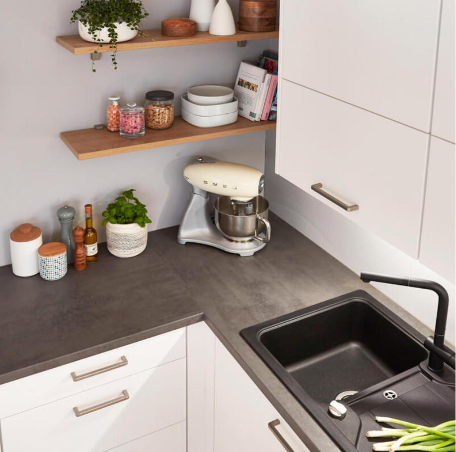• das Arbeitsplattendekor (198 Eiche Sierra oder 354 Beton Schiefergrau) frei wählen