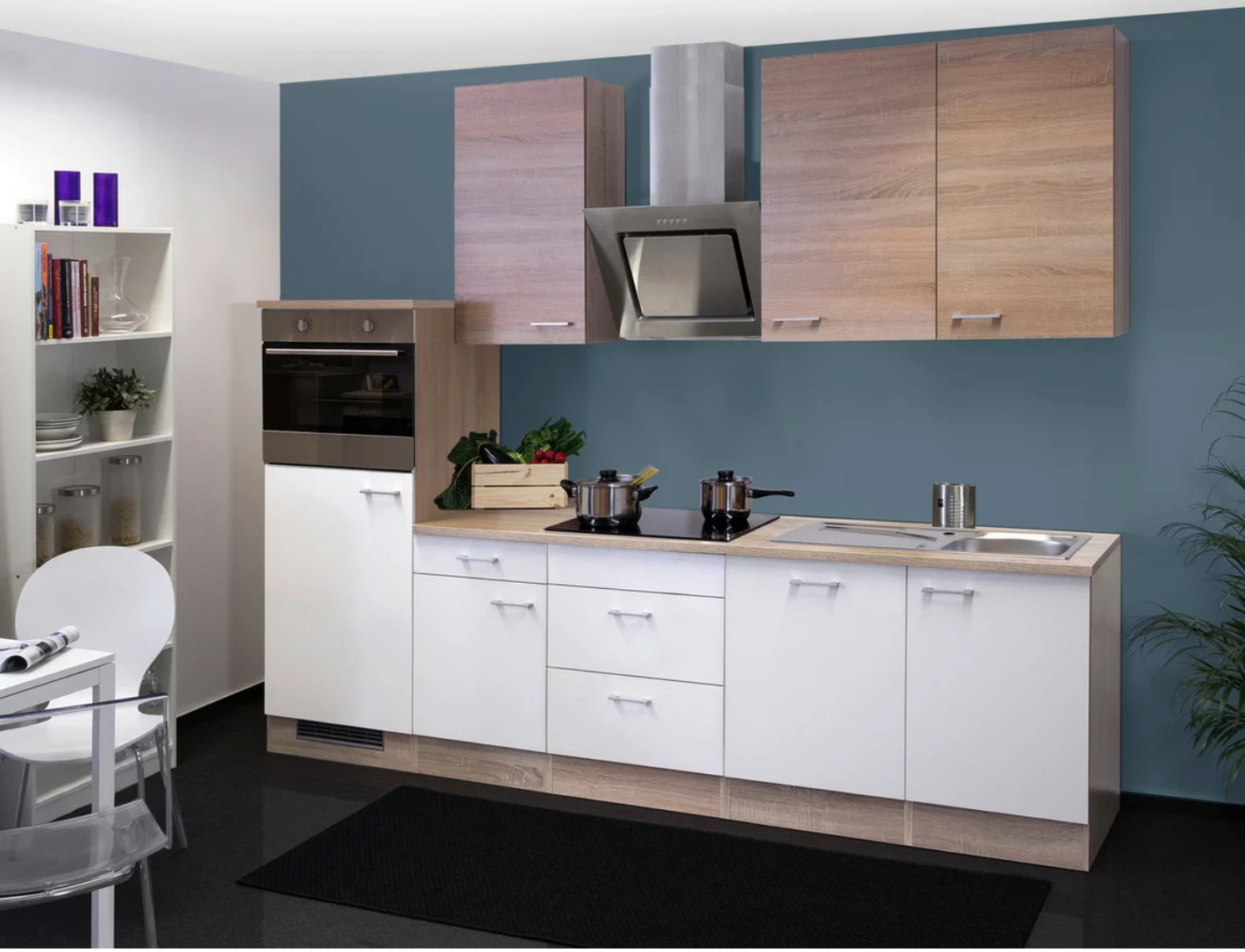 Die Samoa Küchenzeile vereint modernes Design in Weiß mit warmer Sonoma-Eiche-Optik und hochwertiger Ausstattung. Mit einer Breite von 280 cm bietet sie viel Stauraum, eine funktionale Anordnung und bereits integrierte Elektrogeräte – ideal für Familien und moderne Haushalte.
