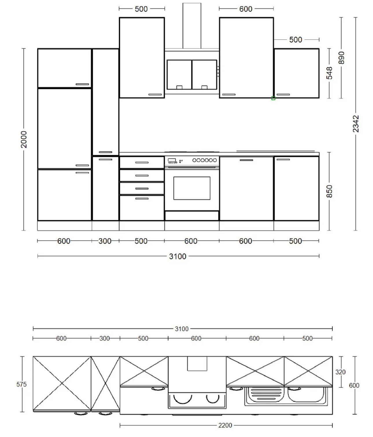 Die großzügige Küchenzeile der Samoa-Serie überzeugt mit modernem Design, viel Stauraum und umfangreicher Ausstattung. Mit einer Breite von 310 cm und einer Höhe von 234 cm eignet sie sich ideal für Familienküchen oder alle, die viel Platz zum Kochen und Verstauen benötigen.