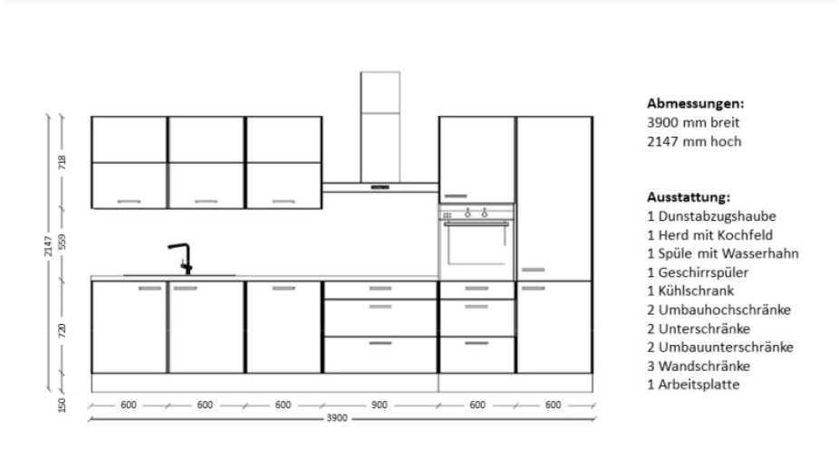 Die Küche besteht aus einem Unterschrank-Block, einem Spülenschrank, einer passenden Geschirrspülerfront, einem Kochstellenschrank sowie zwei Hochschränken für den Backofen und den Kühlschrank. Die Anordnung ist komplett flexibel – alle Elemente können frei nach Deinen räumlichen Gegebenheiten kombiniert werden.