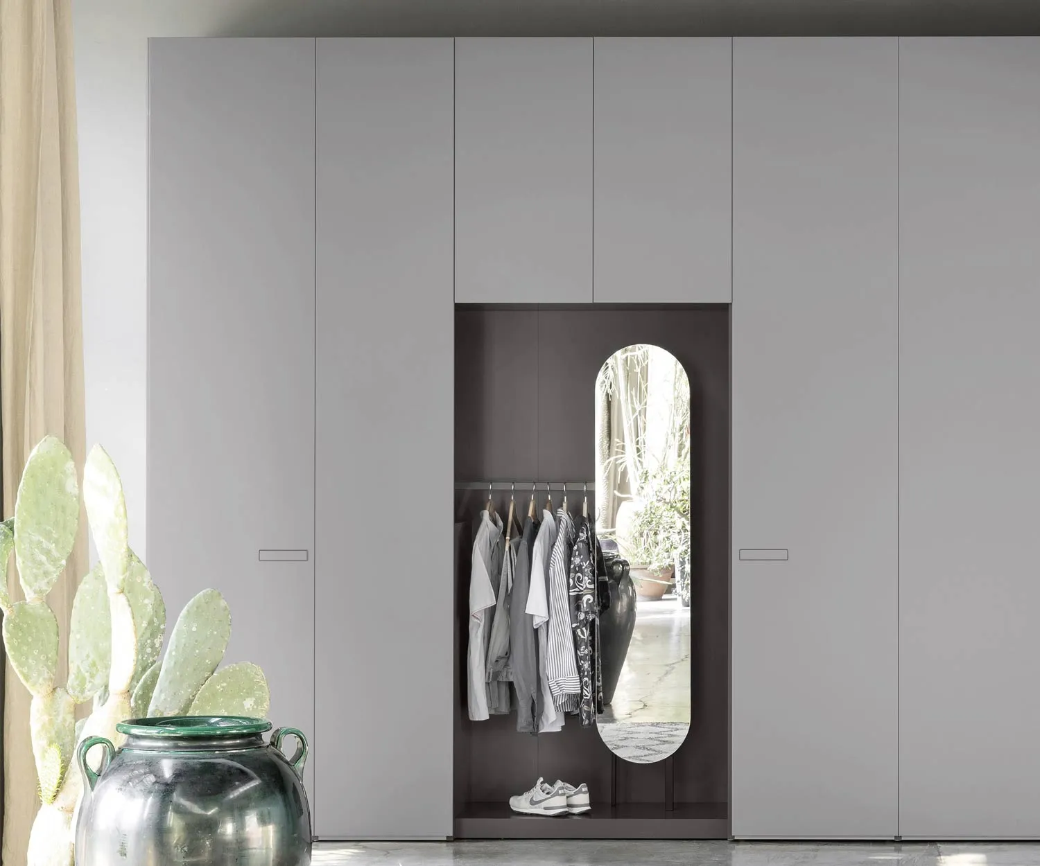 Der Design Kleiderschrank Move von Novamobili überrascht mit seiner klaren Linienführung und einem unaufdringlichen, eleganten Stil. Durch die integrierte Garderobe mit Spiegel erhält der klassische Wandschrank eine völlig neue Dimension – er schafft offene Bereiche, Struktur und ein Gefühl von Großzügigkeit im Raum.
