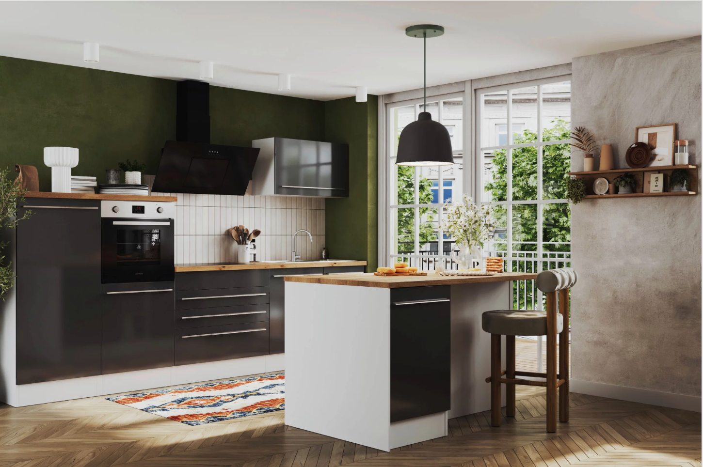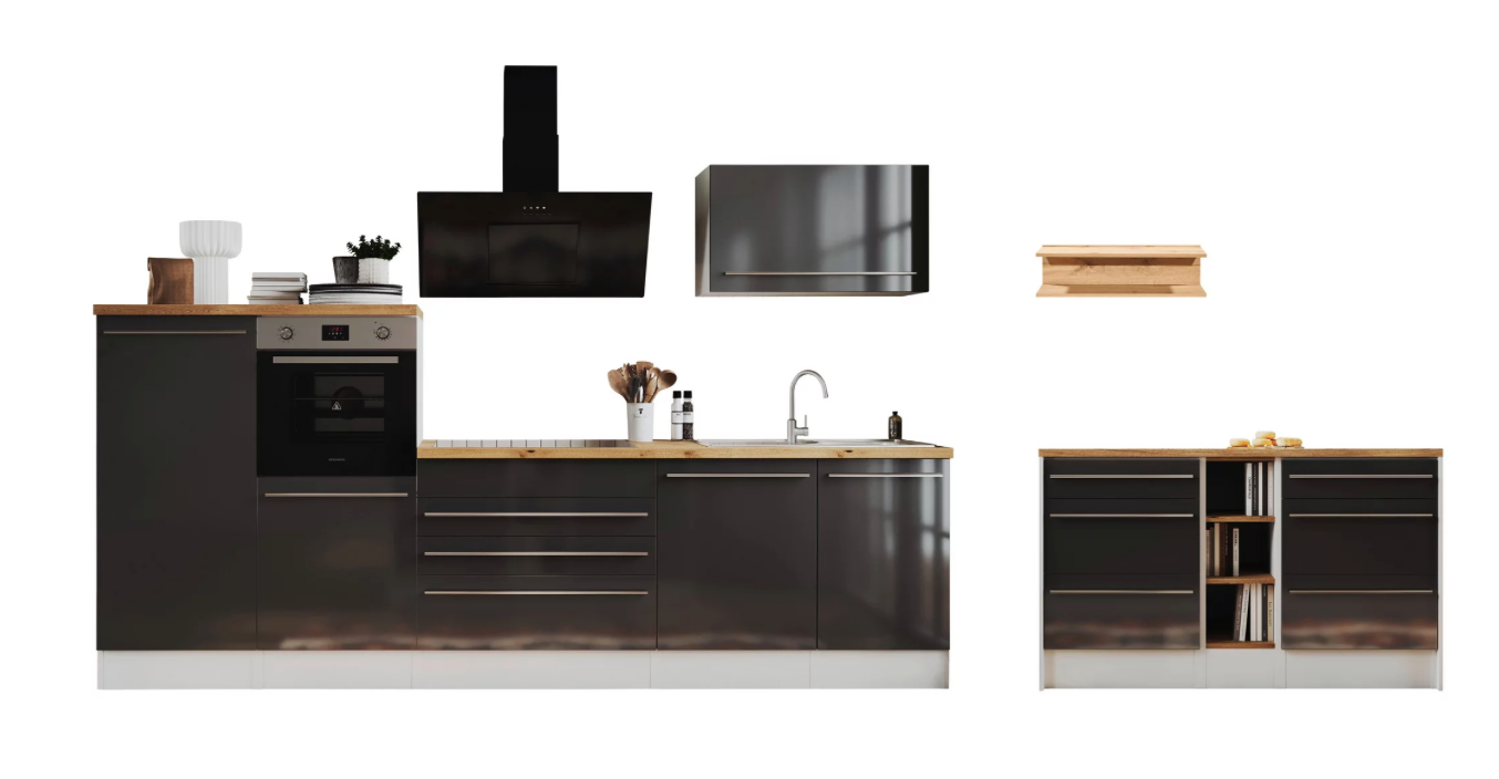 Die Inselküche Gabriel überzeugt durch ihr modernes Design mit grauen Hochglanzfronten und praktischer Funktionalität. Mit großzügigem Stauraum, komfortabler Arbeitshöhe und einer flexibel ausrichtbaren Kochinsel bietet sie viel Platz für kulinarische Kreativität.