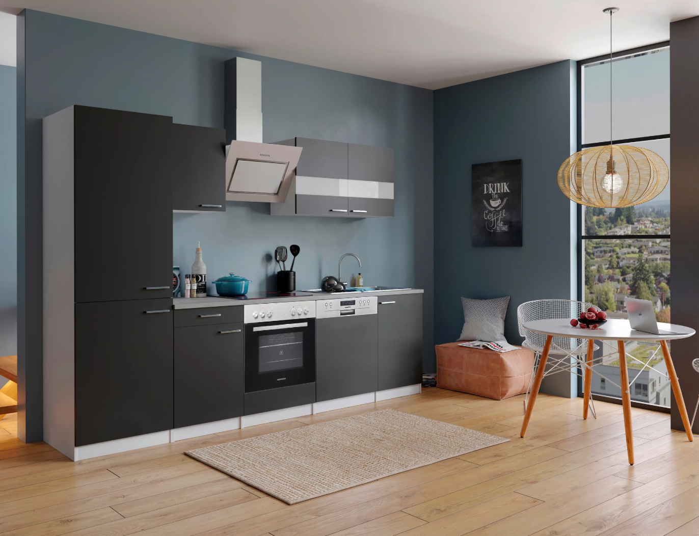 Der Respekta Küchenblock KB280WSCGKE178G in Schwarz mit Beton-Arbeitsplatte kombiniert modernes Design, funktionale Aufteilung und Elektrogeräte in einem kompakten Format – perfekt für kleine bis mittlere Räume.
