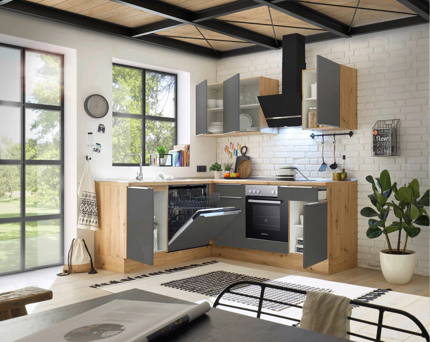 Besonderheit: Die Marleen-Winkelküche bietet eine clevere Ecklösung mit viel Stauraum, Soft-Close-Komfort und einem modernen, grauen Look – perfekt für funktionale und stilvolle Küchengestaltung.