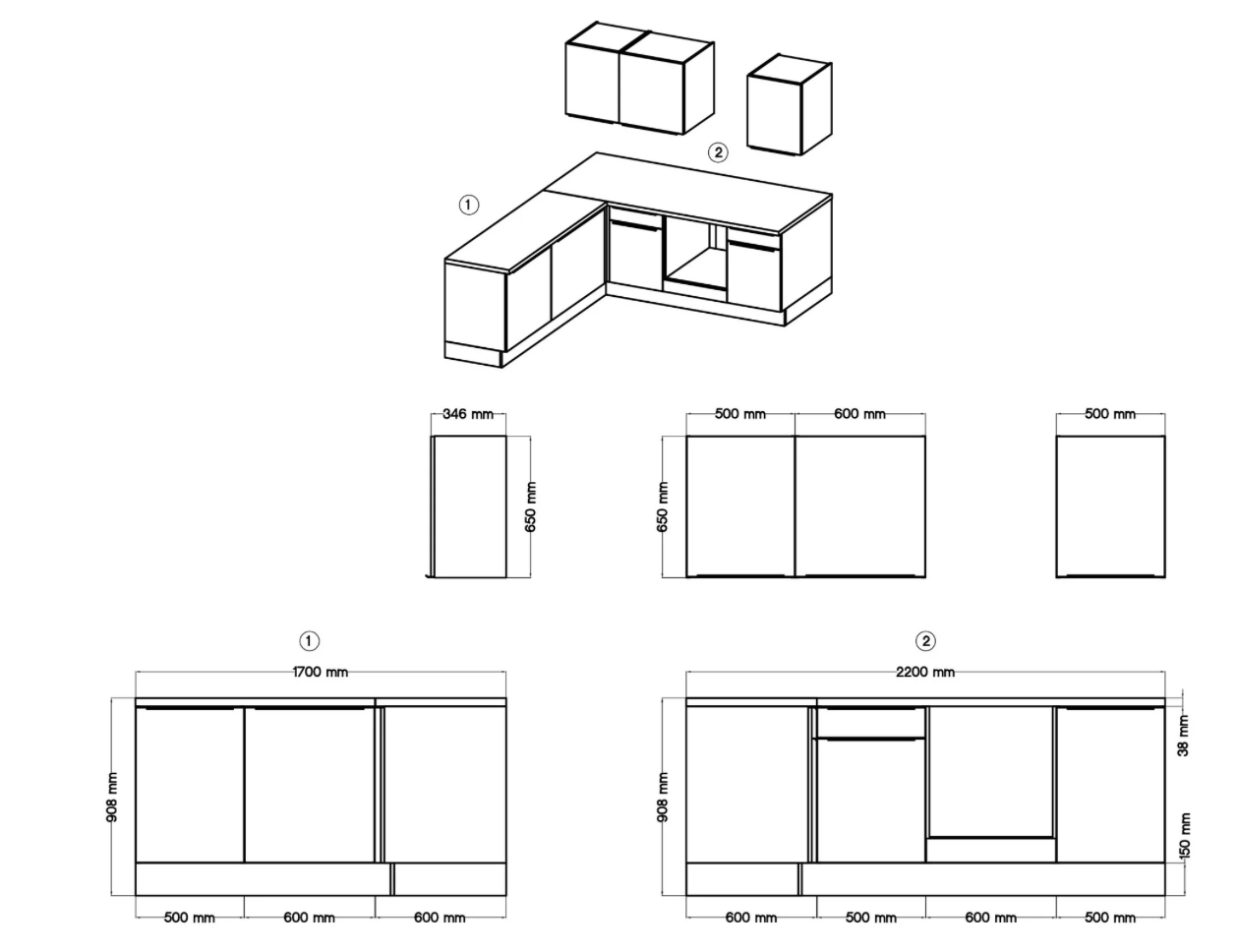 • Arbeitsplatten: 220 cm & 170 cm, 38 mm stark, ohne Ausschnitte