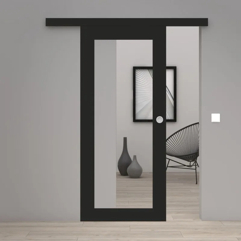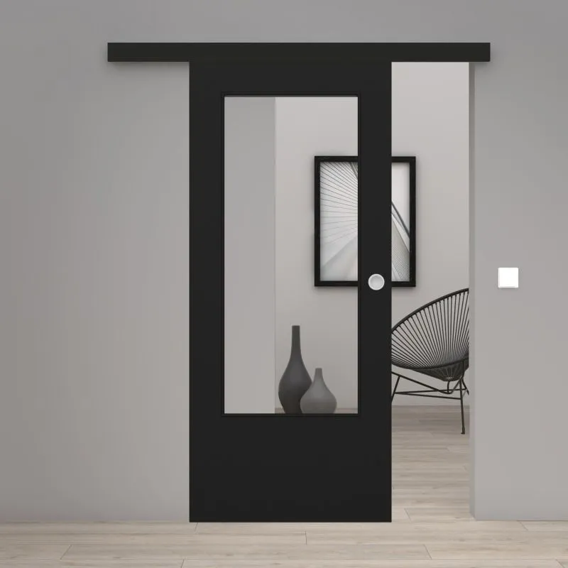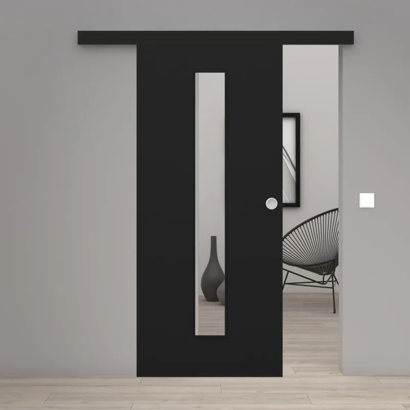 Die Schiebetür Laminato Senso Schwarz matt CPL mit großem Lichtausschnitt bietet mehr als nur funktionales Design. Mit ihrer matten, pflegeleichten Oberfläche, der modernen Farbgebung und der platzsparenden Technik wird sie zum stilvollen Highlight in deinem Zuhause.