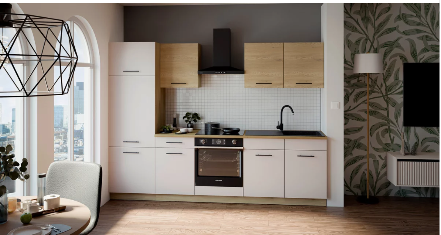 Die Küchenzeile FOX II 270 überzeugt durch ihr stilvolles Erscheinungsbild, hochwertige Materialien und eine clevere Aufteilung. Mit einer Breite von 270 cm bietet sie genügend Platz zum Kochen, Vorbereiten und Verstauen – ideal für moderne Haushalte, die Design und Funktion verbinden möchten.