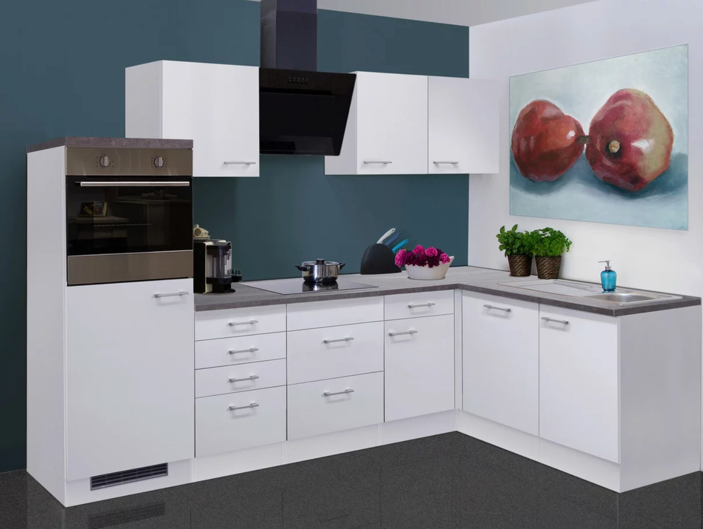 Die Lucca-Serie bietet eine moderne Winkelküche mit elegantem, mattem Weiß und durchdachten Stauraumlösungen. Mit Maßen von ca. 280 × 170 cm und einer Höhe von 200 cm ist sie kompakt, aber gleichzeitig großzügig ausgestattet – inklusive hochwertiger Elektrogeräte.