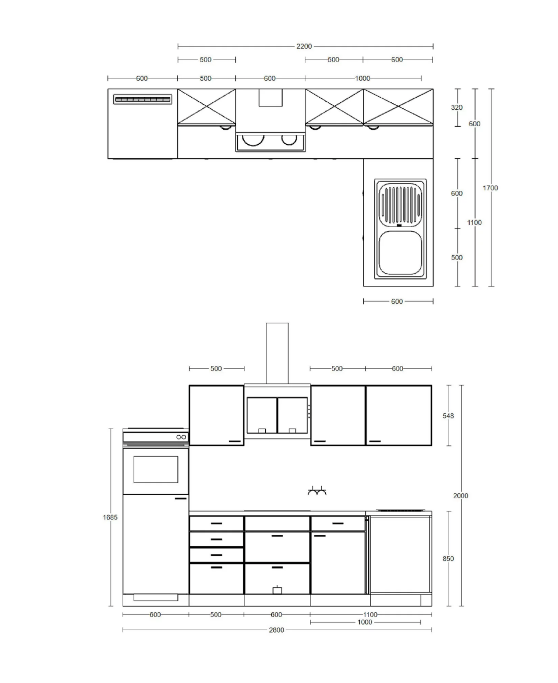 KSA 60 B: Kochstellenunterschrank 60 cm, feste Blende, 2 Auszüge