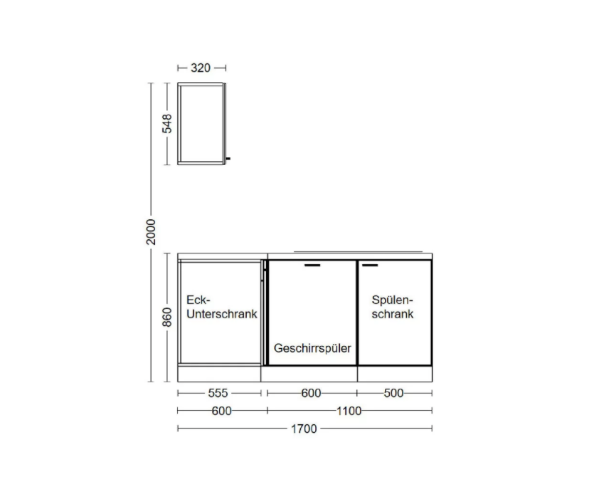 UEBE 110 B: Eckunterschrank (Stellmaß 110 × 60 cm), 1 Tür, 1 Schubkasten, Blindteil, 1 verstellbarer Einlegeboden