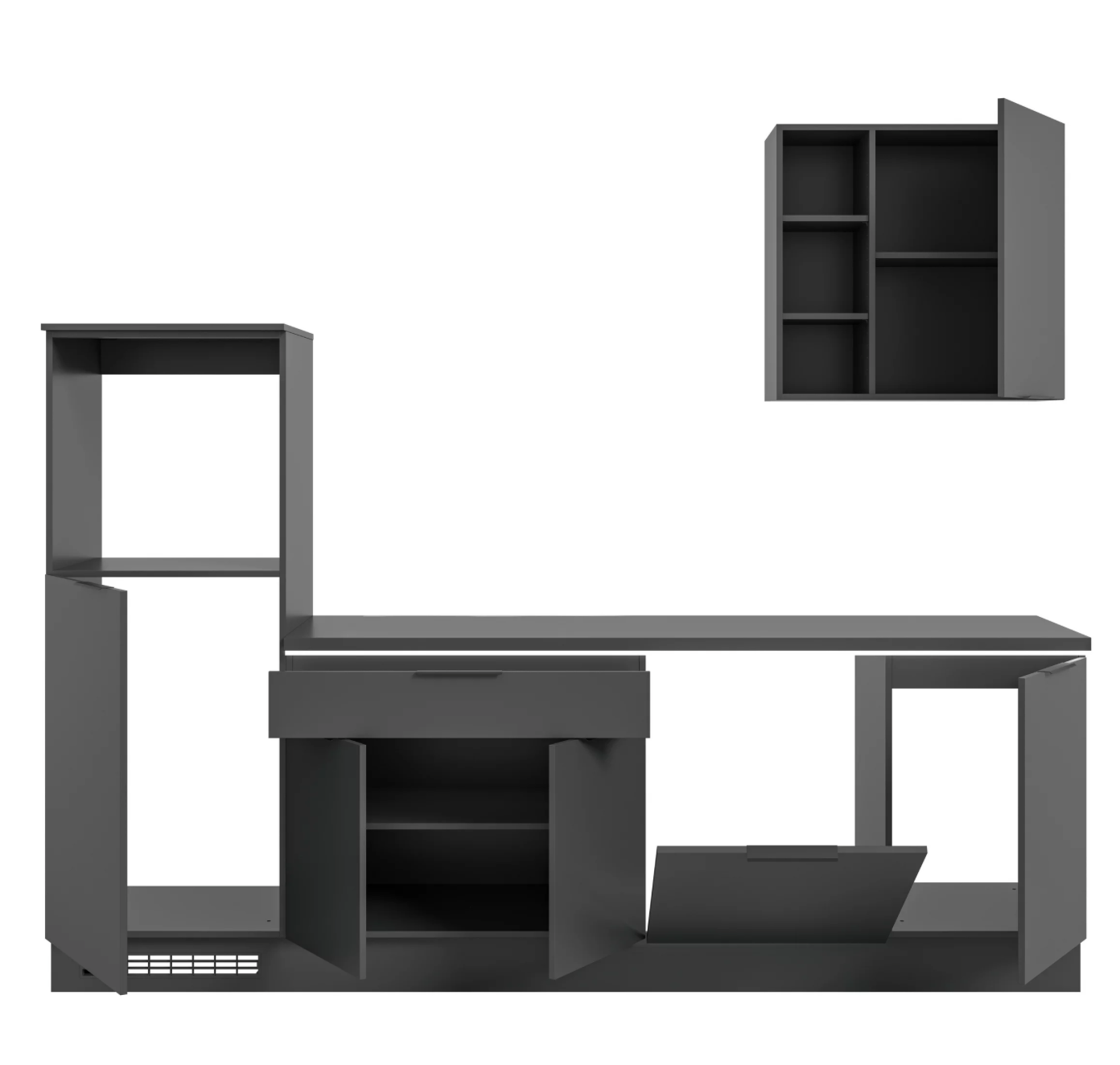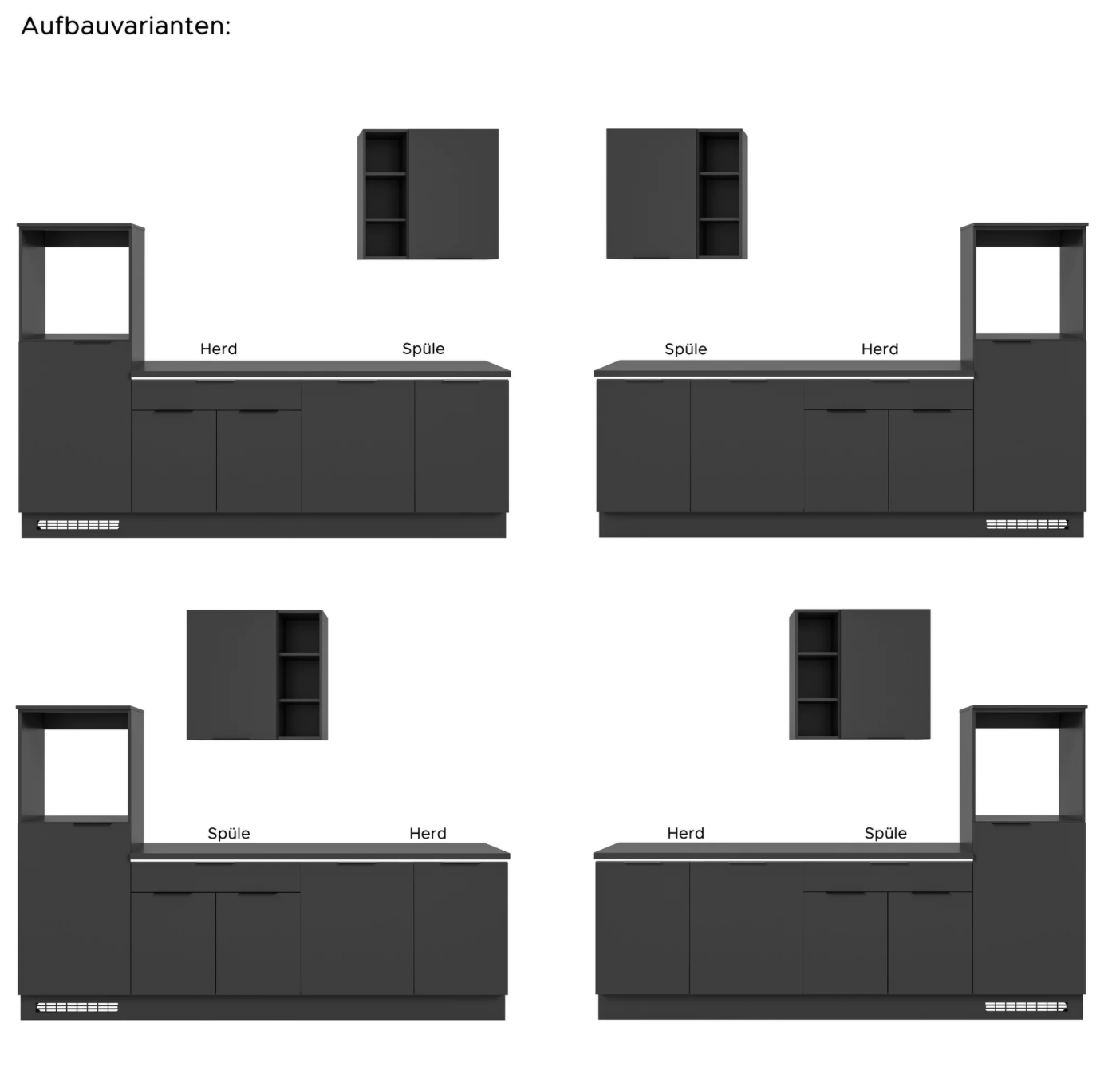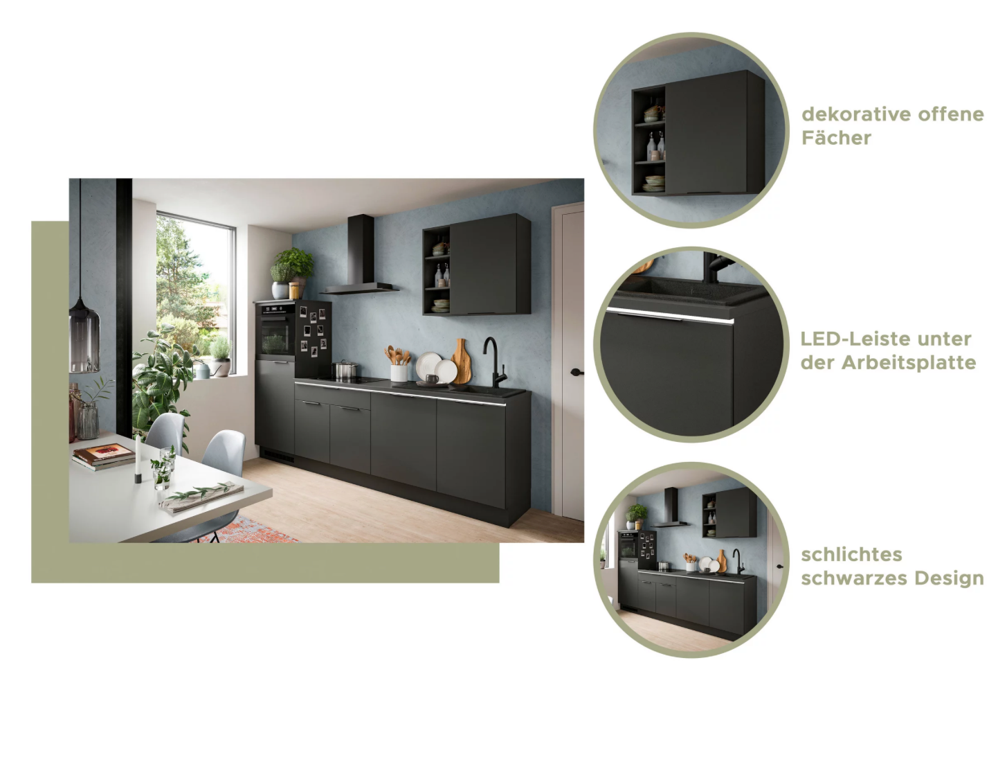 Der Küchenblock Charly kombiniert zeitloses, modernes Design mit funktionaler Ausstattung. Mit seiner eleganten schwarzen Ausführung und den klaren Linien fügt er sich harmonisch in jede Wohnumgebung ein. Dank durchdachter Schrankaufteilung, dimmbarer LED-Beleuchtung und Softclose-Ausstattung ist er sowohl praktisch als auch stilvoll.